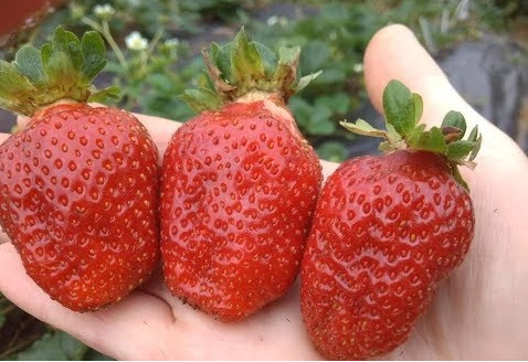 Кусты этого сорта мощные и полураскидистые, с красивыми темно-зелеными зубчатыми листьями. Длинные и толстые цветоносы возвышаются над листьями, но по мере созревания ягод склоняются вниз, укладывая плоды на землю. Соцветий образуется много, и на одном цветоносе может быть до 10 завязей. Цветки белоснежные, а ягоды крупные, овальной или трапециевидной формы с небольшой шейкой. Первые плоды имеют слегка приплюснутый кончик. Кожица плотная, ярко-малиново-красного цвета с лаковым блеском. Мякоть нежная, сочная, сладкая с легкой кислинкой и прекрасным земляничным ароматом. Пустот внутри ягод не бывает, а средний вес плодов составляет 35-50 г.